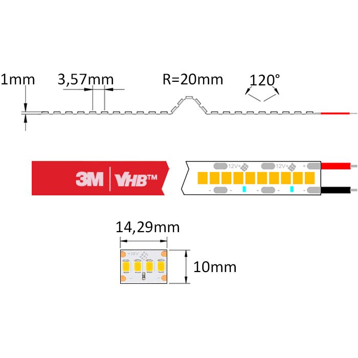 Wysokiej jakości mocno świecąca taśma LED biała 12V SC12280 wyposażona jest w ułatwiającą montaż samoprzylepną taśmę dwustronną najwyższej klasy 3M VHB. Ten rodzaj taśmy samoprzylepnej zapewnia doskonałą przyczepność do powierzchni i najlepsze odprowadzanie ciepła.