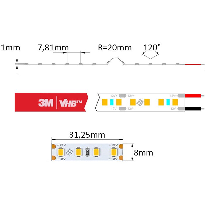 Wysokiej jakości mocno świecąca taśma LED biała 12V SC12128 wyposażona jest w ułatwiającą montaż samoprzylepną taśmę dwustronną najwyższej klasy 3M VHB. Ten rodzaj taśmy samoprzylepnej zapewnia doskonałą przyczepność do powierzchni i najlepsze odprowadzanie ciepła.