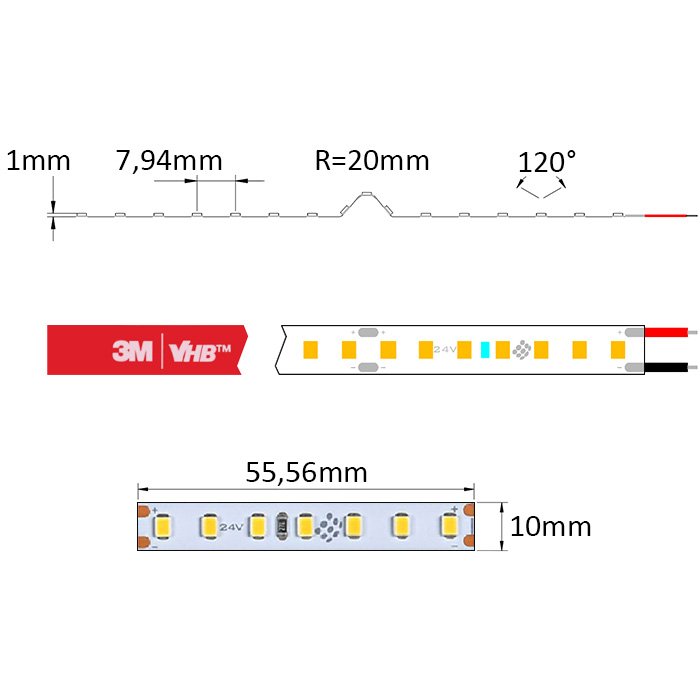Wysokiej jakości mocno świecąca taśma LED biała 24V SC24126 wyposażona jest w ułatwiającą montaż samoprzylepną taśmę dwustronną najwyższej klasy 3M VHB. Ten rodzaj taśmy samoprzylepnej zapewnia doskonałą przyczepność do powierzchni i najlepsze odprowadzanie ciepła.