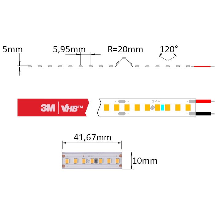 Wysokiej jakości mocno świecąca wodoszczelna taśma LED 24V SC24168 wyposażona jest w ułatwiającą montaż samoprzylepną taśmę dwustronną najwyższej klasy 3M VHB. Ten rodzaj taśmy samoprzylepnej zapewnia doskonałą przyczepność do powierzchni i najlepsze odprowadzanie ciepła.