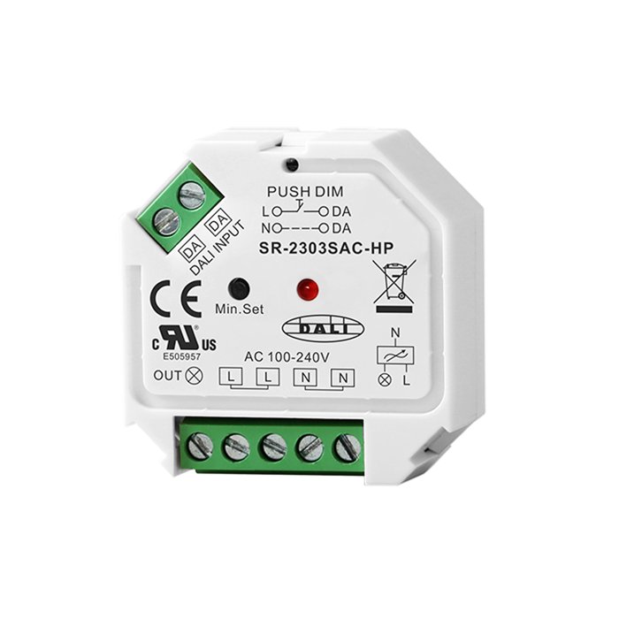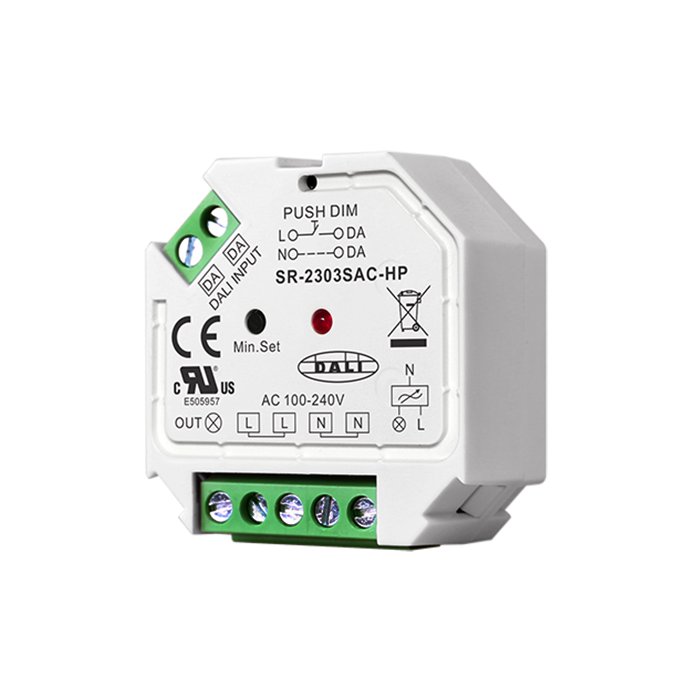 DALI-2 Ściemniacz LED 230V do oświetlenia o oznaczeniu SR-2303SAC-HP to wysokiej klasy produkt elektroniczny przeznaczony do ściemniania oświetlenia, żarówek LED i innych urządzeń przez protokół DALI-2 (wsteczna kompatybilność z DALI). Umożliwia podłączenie powszechnie dostępnych wyłączników przyciskowych za pośrednictwem magistrali PUSH-DIM lub integrację z systemami automatyki budynkowej za pośrednictwem protokołu DALI-2 w celu precyzyjnego i płynnego ściemniania świateł LED, żarówek i innych urządzeń. Ściemniacz DALI-2 230V SR-2303SAC-HP obsługuje funkcję Trailing Edge Dimming (zbocze opadające). Ponadto nowoczesne funkcje i zaawansowana elektronika pozwalają na ustawienie minimalnego poziomu jasności. Jego zaletą jest również miniaturowy rozmiar z możliwością montażu w podtynkowej puszce elektroinstalacyjnej KU68.