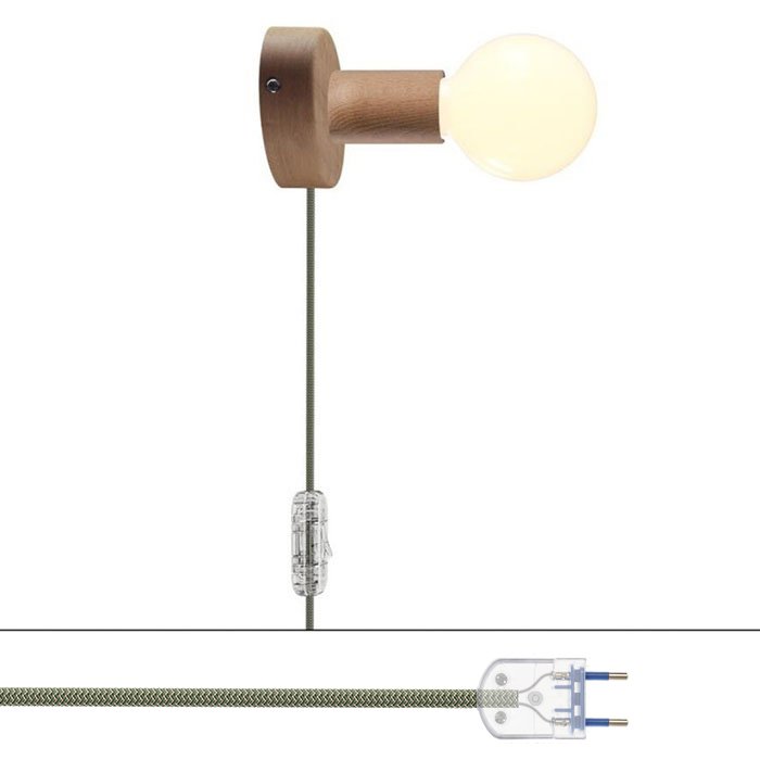 Kinkiet z włącznikiem wyróżnia się drewnianym wykonaniem oraz takimi elementami jak oprawka żarówki E27, wyłącznik kołyskowy na kablu i wtyczka do gniazdka 230 V. Wszystko to doskonale zgrane i zaprojektowane przez włoskich mistrzów światła.