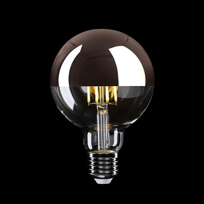 Przezroczysta szklana bańka zapewnia jasny i intensywny strumień światła, a miedziana powłoka odbija część światła z powrotem do oprawy. Zmniejsza to oślepienie i kieruje światło głównie w dół. Lustrzana powierzchnia nadaje żarówce elegancki, nowoczesny wygląd i luksusowy charakter.Taka konstrukcja pozwala uzyskać światło o następujących właściwościach: