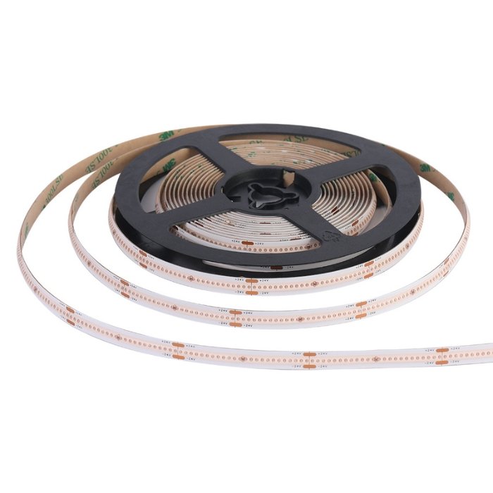 - Oryginalne opakowanie - obejmuje opakowanie elektrostatyczne, plastikową rolkę z nawiniętą taśmą COB 24V COB-SC24480E o długości 5 m, z kablami zasilającymi (AWG22 15 cm).