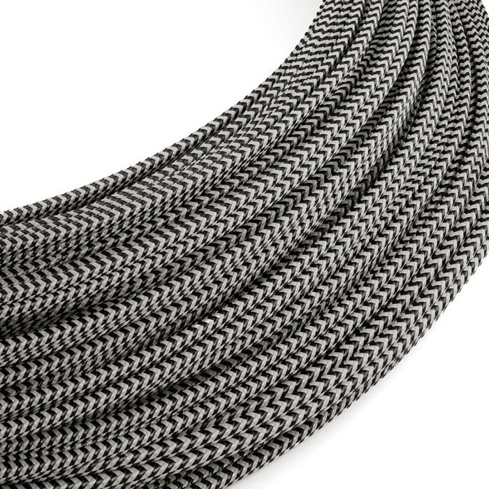Przewód w oplocie ze wzorem w zygzaki do instalacji niskonapięciowej został wykonany ze sztucznego jedwabiu. Przewód elektryczny w oplocie jedwabnym charakteryzuje się gładką, a nawet lekko błyszczącą powierzchnią o wyraźnych barwach. Materiał ten również najlepiej oddaje temperament zygzakowatego stylu kabla w oplocie. Czarno-białe wykończenie łączy piękno tych tradycyjnych barw z nowym procesem produkcji, który jeszcze bardziej oddaje ich charakter i błyszczący wygląd. Kabel w oplocie jedwabnym ze wzorem w zygzaki wspaniale pasuje do wnętrz w stylu retro i vintage. Wzorzysty kabel w oplocie typu RZ04 przemawia do wszystkich twórczych dusz, ponieważ po prostu przyciąga uwagę.