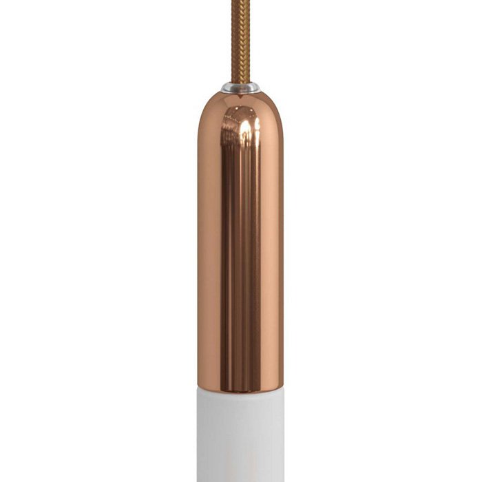 - miedź | ⚫ podsufitka do lamp metalowa Rose-One Ø200 mm - z trzema otworami i białym korpusem [KROR203TF103], ⚫ kabel w oplocie ze wzorem Vertigo "czarny + miedziany" ERM66 - tekstylia HD | długość 150/165/180 cm: [XZ2ERM66], ⚫ 3x miedziana oprawka żarówki ozdobna E14 z ukrytą blokadą kabla P-Light [KBME14RA]