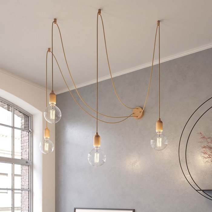 Lampa Spider Wood to wyjątkowa wisząca lampa sufitowa, która jest zarówno funkcjonalna, jak i dekoracyjna. Niektórzy mogą się bać nazwy pająk, ale nie ma takiej potrzeby. Jest to fascynująca lampa wisząca z czterema długimi ramionami, których położenie można w dowolny sposób regulować podczas montażu. Nasza lampa sufitowa pająk Spider Wood może być doskonałą alternatywą dla każdego dużego żyrandola i świetnym wyborem dla tych, których interesuje niecodzienna lampa do dużych pomieszczeń. Lampa Spider Wood może oświetlić dużą powierzchnię. Jej ramiona mogą być także zawieszone nad konkretnymi miejscami w pomieszczeniu. Elastyczność i różnorodność zastosowań to jedne z największych zalet tego typu oświetlenia. Wszystkie kreatywne dusze będą zachwycone możliwością wyboru spośród kilku wariantów kolorystycznych. Każdy z elementów takich jak 1x podsufitka lampy, 4x przewód w oplocie tekstylnym o długości 4x 300 cm, 4x haczyki sufitowe do mocowania kabla oraz 4x drewniane oprawki żarówek zostały starannie dobrane i dopasowane do ostatniego szczegółu. Charakterystyczne elementy takie jak podsufitka i oprawki żarówek wykonane są w 100 % z drewna bukowego o doskonałym wykończeniu i rzemieślniczym wykonaniu. Ich niepowtarzalny wygląd i jakość gwarantuje produkcja Made in Italy. Naszym celem było stworzenie żyrandola typu pająk o wyjątkowym wyglądzie i właściwościach.
