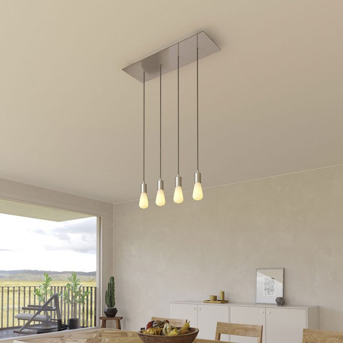 Lampa wisząca nad stół 4x E27 to jedna z fascynujących lamp sufitowych wiszących. Wyeksponowane żarówki lampy nadają pomieszczeniu niesamowity efekt scenograficzny. Lampa z oprawkami wyróżnia się wyjątkowej jakości wykonaniem i materiałami, które przeszły staranną selekcję. Naszym celem było stworzenie doskonałego dużego żyrandola żarówkowego, który zainteresuje wszystkie kreatywne dusze. Detale dużej lampy sufitowej dopełniają takie metalowe komponenty jak 4 oprawki żarówki i rozeta do lamp XXL Rose One. Niepowtarzalnego charakteru nadają żyrandolowi designowe kable w oplocie tekstylnym o długości 120 cm. Kable lampy można łatwo skrócić do wybranej długości podczas montażu oprawy. Wszystkie komponenty nowoczesnego żyrandola wyróżniają się wysoką jakością techniczną i wyjątkowym designem. Pochodzą one z produkcji MADE IN ITALY.
