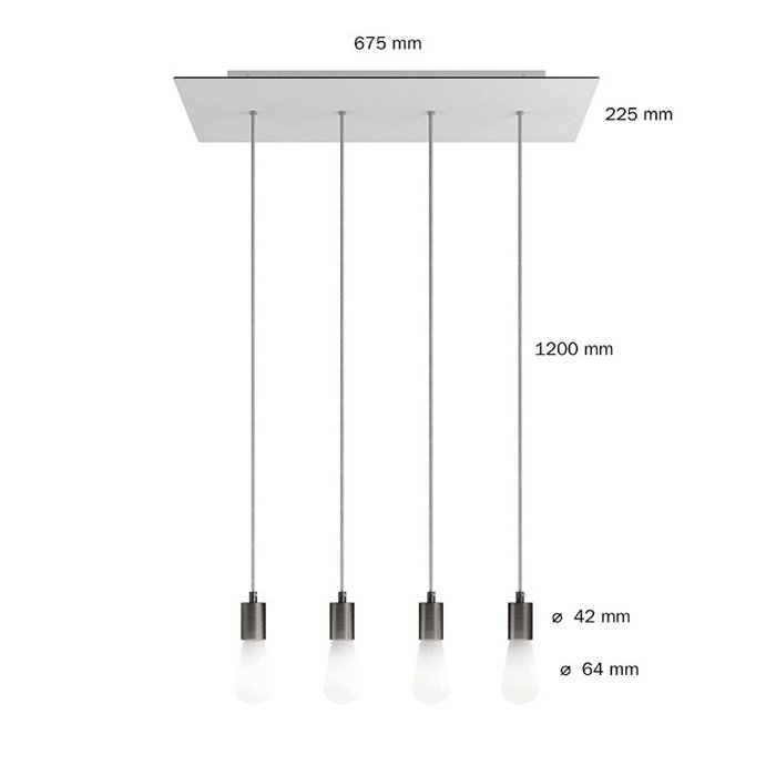- stalowy satynowy dibond | ⚫ podsufitka do lamp metalowa Rose-One XXL 675 x 225 mm - z czterema otworami [KROVBORE4F109], ⚫ kabel materiałowy szary RM03 - jedwabny | długość: 4x 120 cm: [XZ2RM03], ⚫ 4x chromowa oprawka żarówki metalowa E27 z walcowatą blokadą kabla [KBM4011CRTERM]