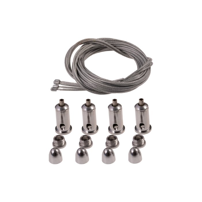 Montaż zestawu do zawieszania Hangin jest szybki i łatwy. Najpierw należy zamocować elementy mocujące na suficie. Następnie zawiesić stalowe linki w uchwytach. Informujemy, że wkręt do mocowania linki w panelu LED lub oprawie oświetleniowej nie wchodzi w skład zestawu. Należy użyć własnego wkrętu o odpowiednim rozmiarze, aby nie uszkodzić panelu lub oprawy oświetleniowej. Wysokość zawieszenia można łatwo regulować, przesuwając stalową linkę w mechanizmie przesuwnym uchwytu sufitowego, co pozwala uzyskać pożądaną pozycję panelu.