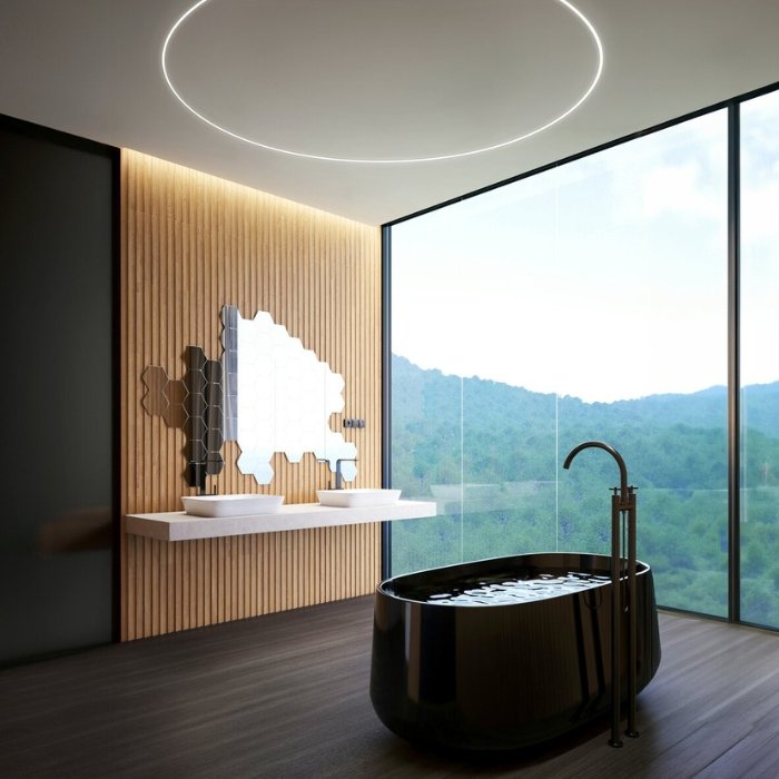 - Do geometrycznych kształtów oświetlenia wykorzystaj łączniki do profili LED i aluminiowych listew.
