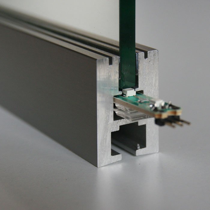 - Montaż powierzchniowy na krawędzi szyb i tafli szklanych- w kierunku poziomym lub pionowym.