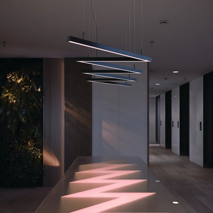 - Wiszące oświetlenie liniowe o geometrycznych kształtach - oświetlenie przestrzeni za pomocą zwieszanej oprawy sufitowej.