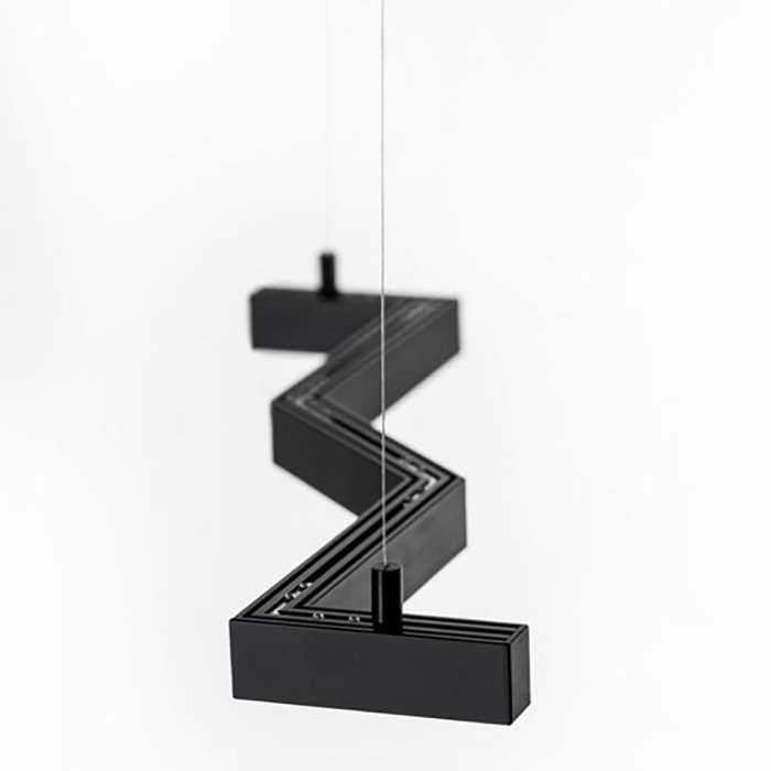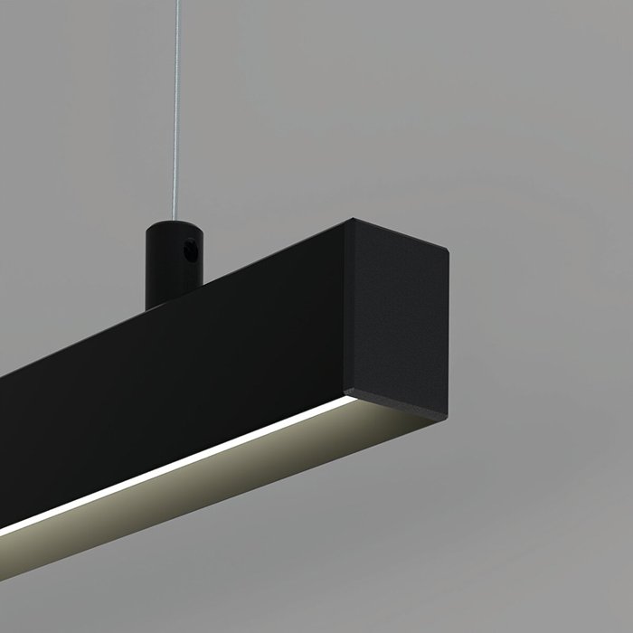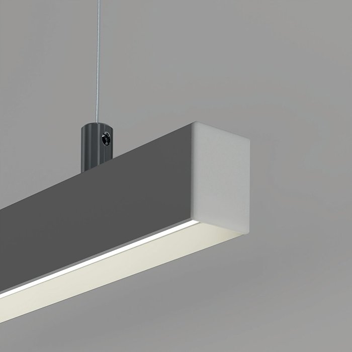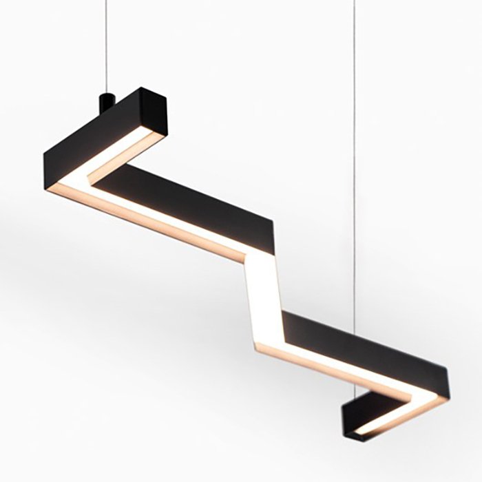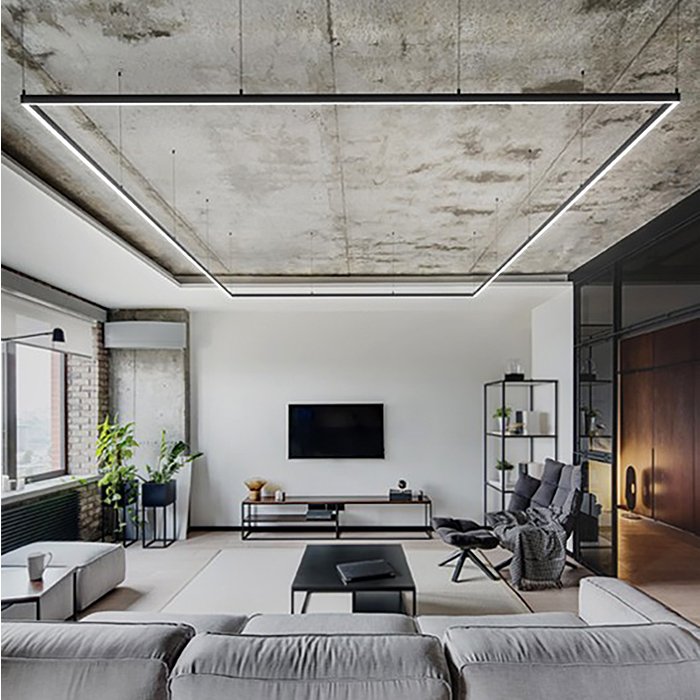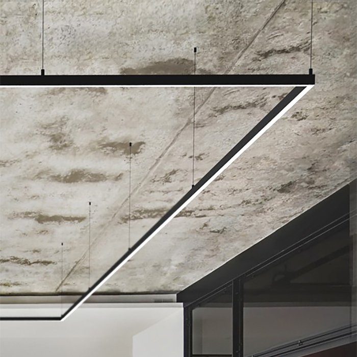 - Wiszące oświetlenie liniowe o geometrycznych kształtach - oświetlenie przestrzeni za pomocą zwieszanej oprawy sufitowej.