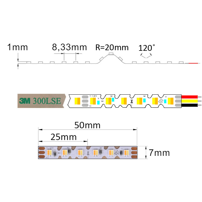 - 120 LED/m liczba diod LED na 1 metr bieżący – każdy pojedynczy chip LED w obudowie zawiera zarówno diodę LED o barwie ciepłej białej (WW), jak i zimnej białej (CW), co umożliwia płynną zmianę temperatury barwowej w obrębie jednego punktu świetlnego.