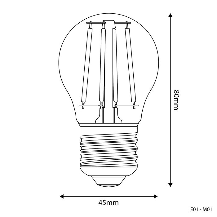 Przezroczysta żarówka LED BeBulbs-E z gwintem E27 to energooszczędne źródło światła o długiej żywotności. Kompaktowy kształt przypominający kulkę G45 (Mini Globe - w najszerszym miejscu Ø 45mm) idealnie komponuje się z popularnymi oprawami oświetleniowymi łącząc klasyczny design z nowoczesną technologią LED. Precyzyjne wykonanie techniczne w połączeniu z renomowaną jakością marki BeBulbs gwarantuje doskonałe właściwości świetlne, wysoką wydajność i maksymalną satysfakcję z codziennego użytkowania.