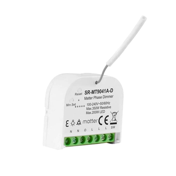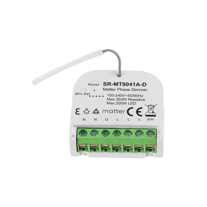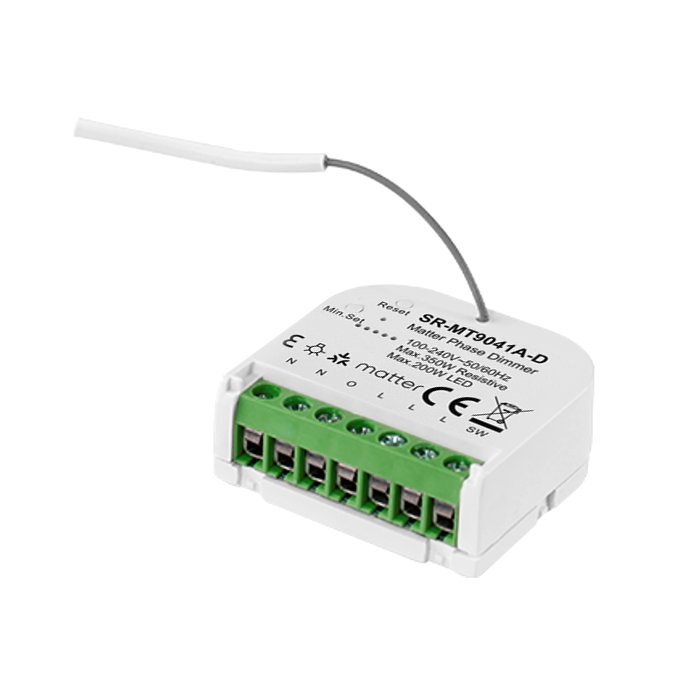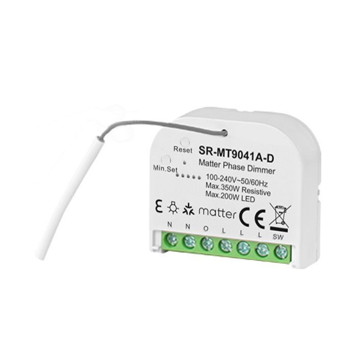 Ściemniacz Matter 230V SR-MT9041A-D to certyfikowany produkt (Connectivity Standards Alliance), który wykorzystuje połączenie standardów LAN, WIFI, Thread, Bluetooth Low Energy (BLE) do przesyłania sygnału sterującego w celu uzyskania solidnego, elastycznego i bezpiecznego systemu sterowania inteligentnym domem. Kluczową zaletą ściemniacza oświetlenia 230V Matter jest jego szeroka kompatybilność z produktami różnych producentów, które wykorzystują technologię Matter. Urządzenia te płynnie komunikują się ze sobą i mogą być zintegrowane w jeden system oświetleniowy.