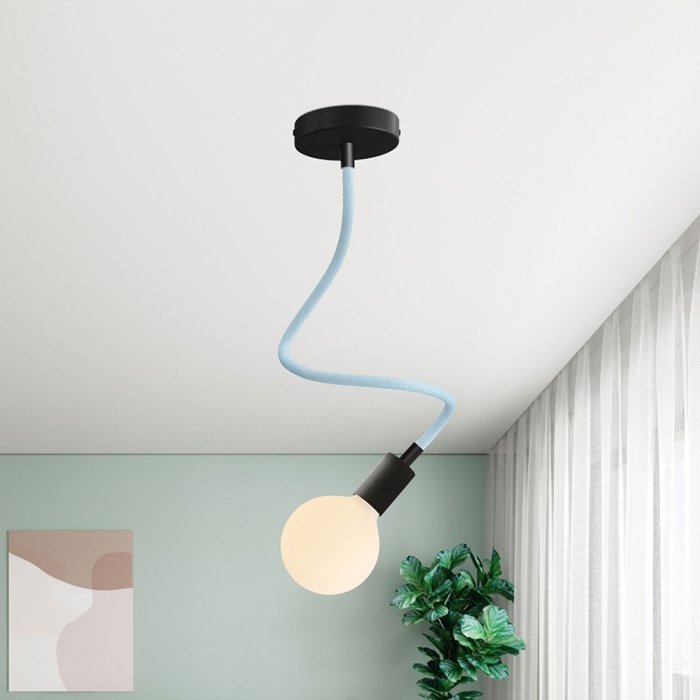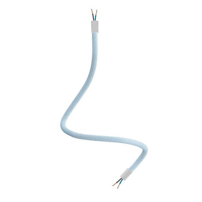 Baby Blue elastyczne ramię do lampy i kreatywnych instalacji oświetleniowych Flex RM76 to doskonały wybór dla wszystkich, którzy chcą tworzyć oryginalne oprawy oświetleniowe lub eksperymentować z różnymi sposobami montażu oświetlenia. Umożliwia pochylanie, obracanie i kształtowanie, jest wyposażone w rurkę gwintowaną M10 na obu końcach. Wewnątrz ramienia znajduje się już przewód 2×0,75 mm², który wystaje po obu stronach, co ułatwia podłączenie elementów, takich jak sufitowe lub ścienne osłony lamp lub oprawki do żarówek.