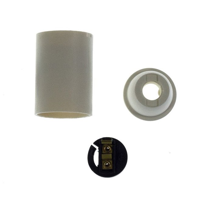 Plastikowa oprawka żarówki E14 Plastini składa się z kilku precyzyjnie wykonanych części, które dokładnie do siebie pasują i tworzą zwartą i funkcjonalną całość. Konstrukcyjnie składa się z obudowy zewnętrznej (osłona dekoracyjna) i modułu wewnętrznego z kontaktami do podłączenia przewodów zasilających: