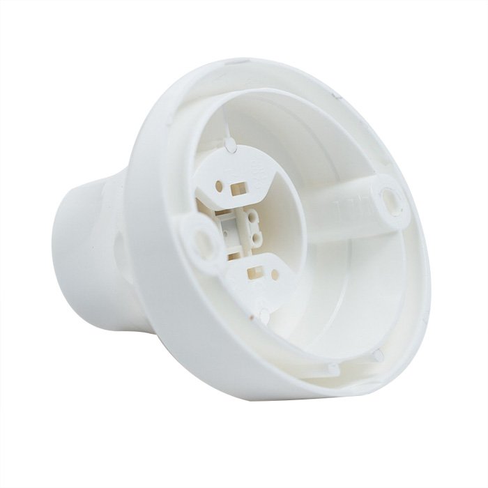Plastikowa oprawka żarówki przykręcana Plastihoofu składa się z kilku precyzyjnie wykonanych części, które dokładnie do siebie pasują i tworzą zwartą i funkcjonalną całość. Konstrukcyjnie składa się z obudowy zewnętrznej (osłona dekoracyjna) i własnej oprawki funkcjonalnej przeznaczonej do umieszczenia żarówki: