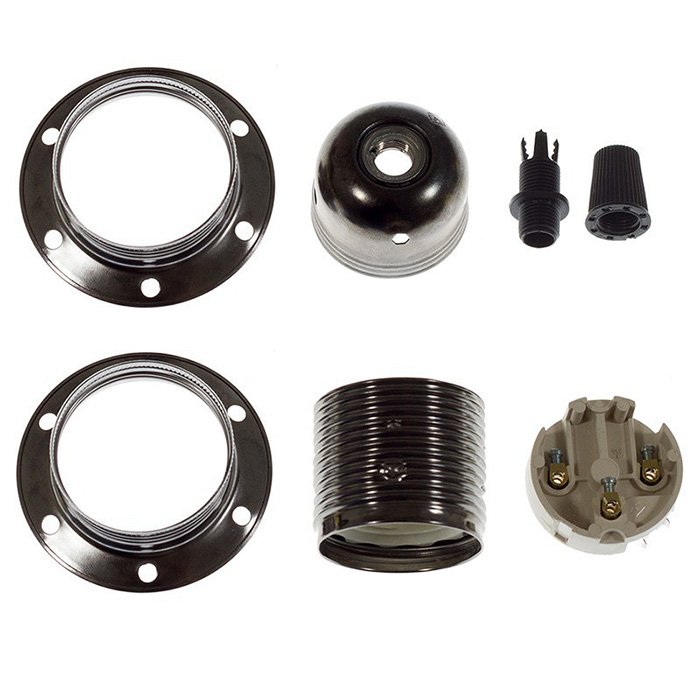 Metalowa oprawka żarówki retro E27 z możliwością montażu klosza Metalnut składa się kilku precyzyjnie wykonanych części, które dokładnie do siebie pasują i tworzą zwartą i funkcjonalną całość. Konstrukcyjnie składa się z obudowy zewnętrznej (osłona dekoracyjna i własnej oprawki funkcjonalnej przeznaczonej do umieszczenia żarówki: