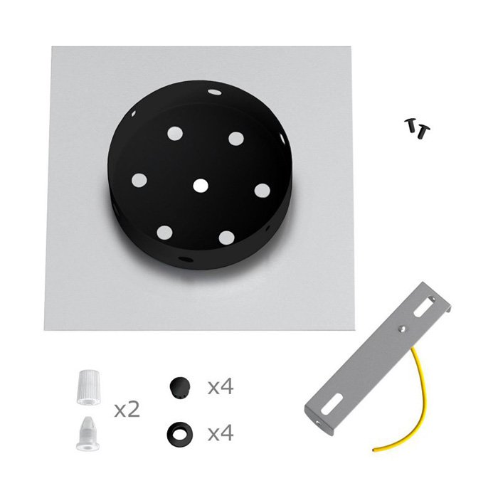 Metalowa rozeta sufitowa do lampy z dwoma dolnymi wyjściami kablowymi o wymiarach 200x200 mm I2-Metalrosa nadaje się do montażu na typowych powierzchniach, takich jak drewno, mur lub płyta gipsowo-kartonowa. Elementy mocujące (śruby i kołki) nie są dołączone do opakowania. Należy je odpowiednio dobrać do konkretnego rodzaju podłoża lub instalacji, możesz także wykorzystać #tablink#montaz#komponenty elektryczne##. Aby zobaczyć, jak wygląda podłączenie i montaż, obejrzyj #tablink#videa#film montażowy##. Ze względu na konieczność manipulowania przy podłączeniu do sieci elektrycznej zalecamy, aby instalację przeprowadziła wykwalifikowana osoba posiadająca odpowiednie uprawnienia elektryczne.