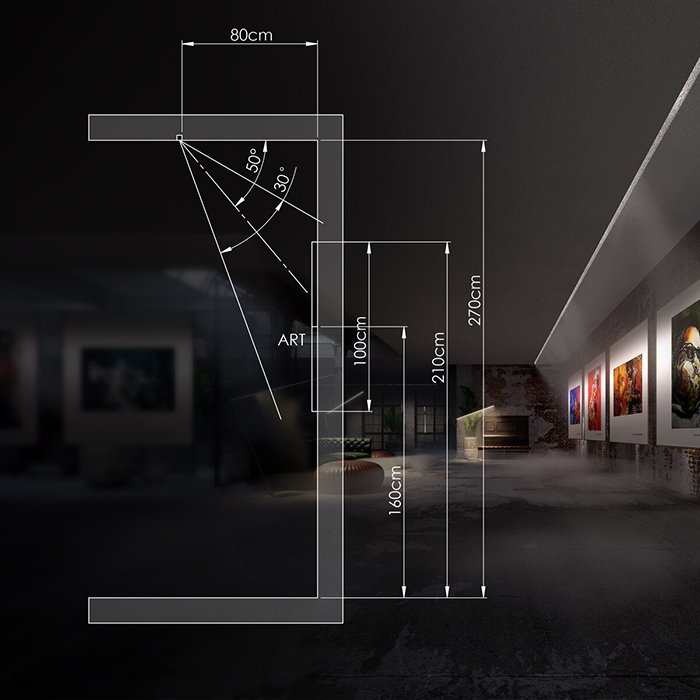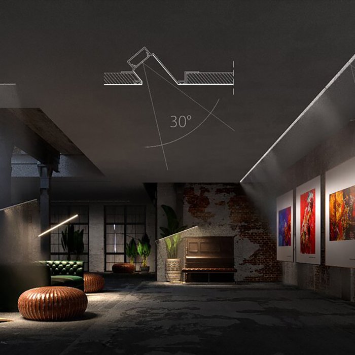 - Liniowe oświetlenie sufitowe przylegającej ściany - oświetlenie walwasher charakteryzuje się montażem sufitowym z oświetleniem przylegającej ściany. Stosowane jest głównie jako oświetlenie galeryjne, sceniczne lub wystawiennicze.