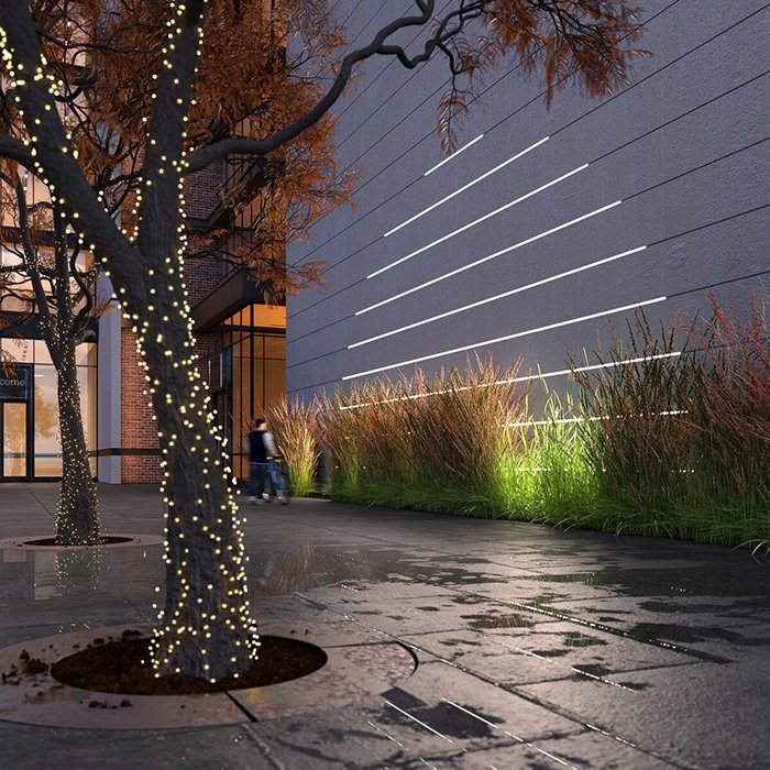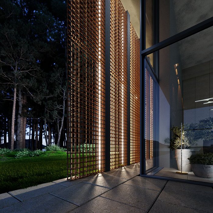 - Liniowe oświetlenie muru lub elewacji - podświetlenie boniowania elewacji, tynku lub fasady.