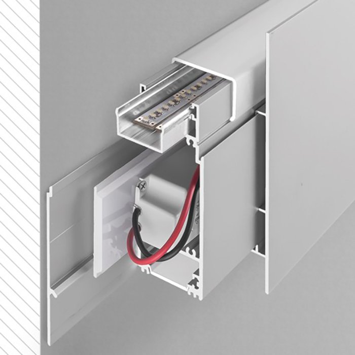 - Profil LED z trzech części - 1/3 przedni panel aluminiowy | 2/3 aluminiowy kształtownik montażowy na ścianę (wchodzi w skład zestawu) | 3/3 dekoracyjny maskujący panel ATRA (element opcjonalny)