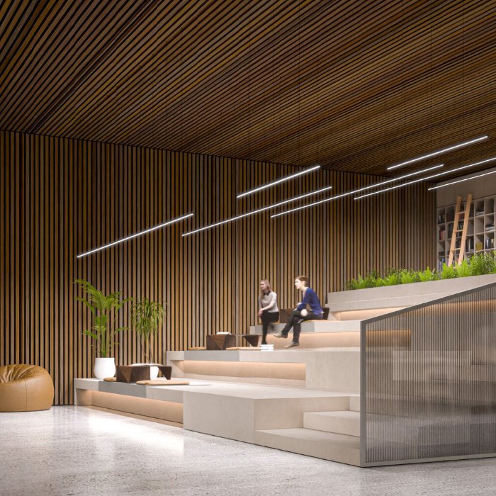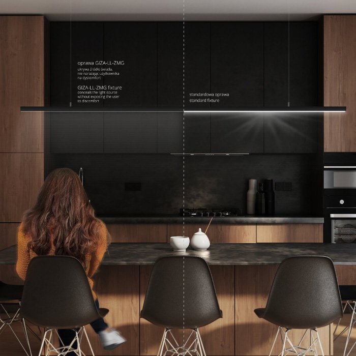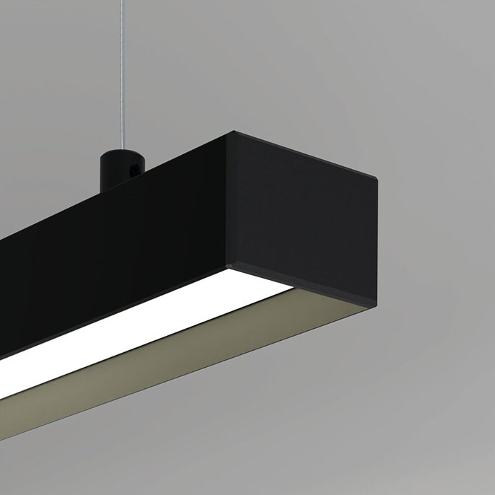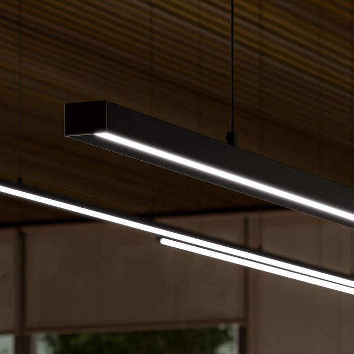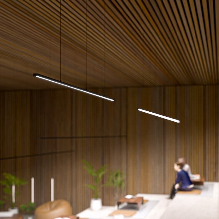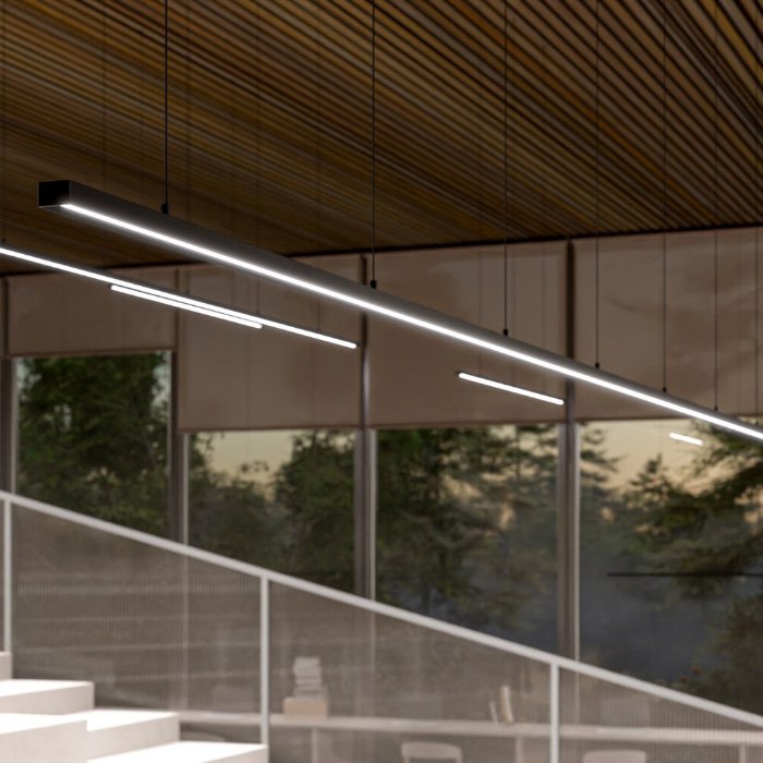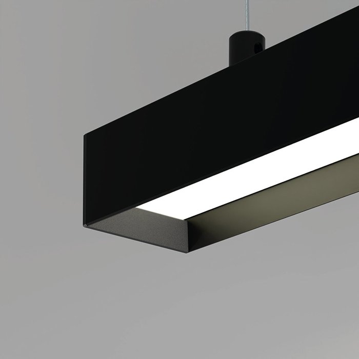 - Wiszące oświetlenie liniowe o geometrycznych kształtach - oświetlenie przestrzeni za pomocą zwieszanej oprawy sufitowej. | Nadaje się na oświetlenie biur i przestrzeni komercyjnych.