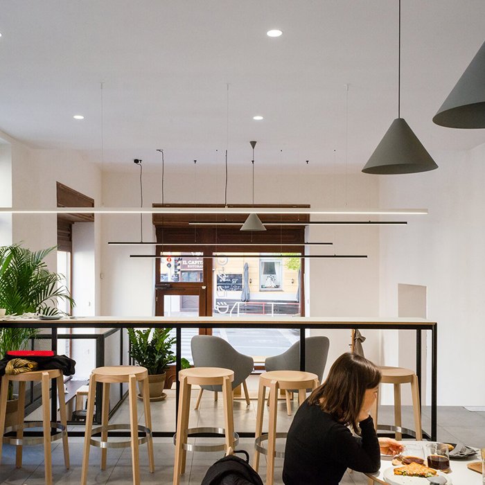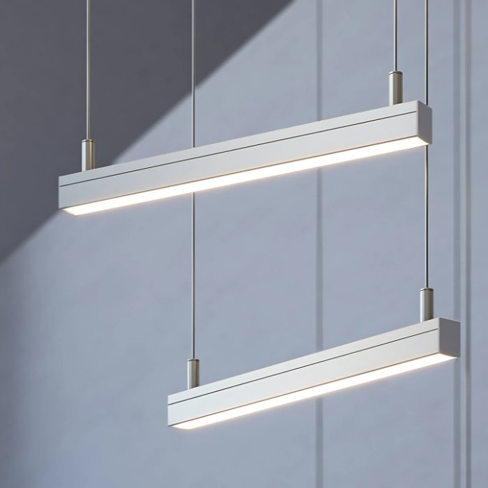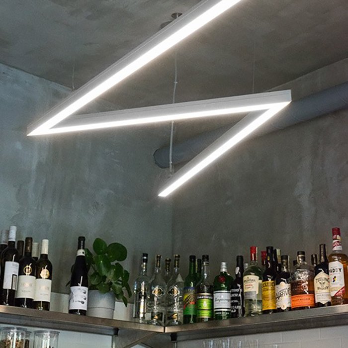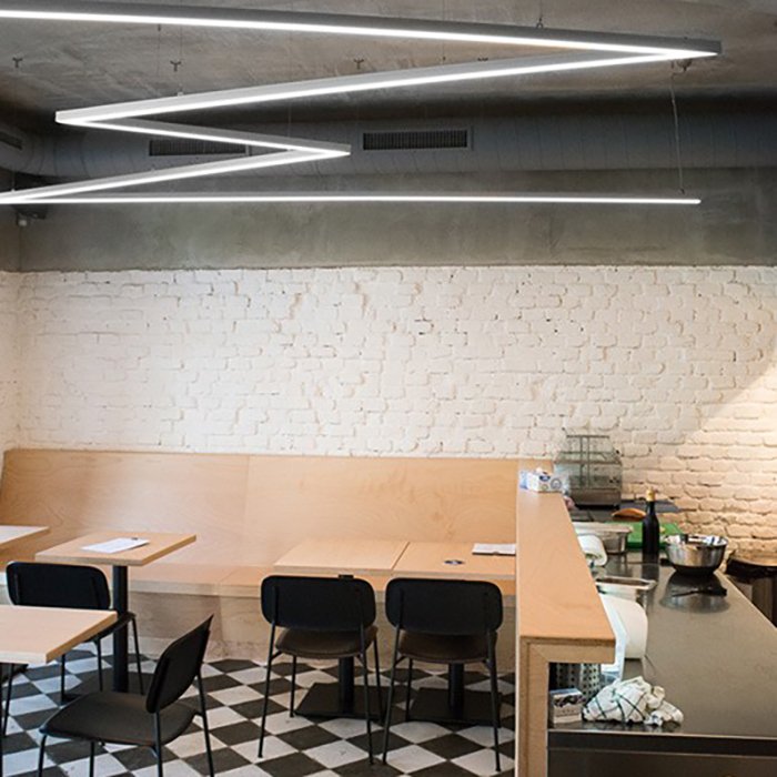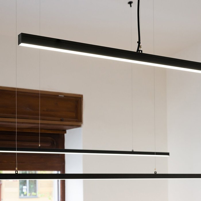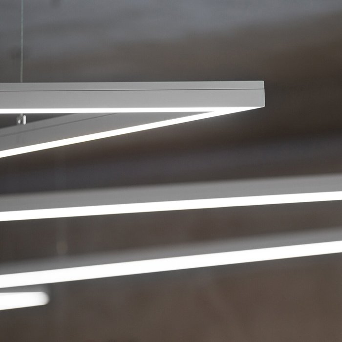 - Wiszące oświetlenie liniowe o geometrycznych kształtach - oświetlenie przestrzeni za pomocą zwieszanej oprawy sufitowej. | Nadaje się na oświetlenie biur i przestrzeni komercyjnych.