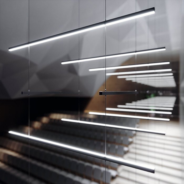 - Linearne oświetlenie wiszące o geometrycznych kształtach - oświetlanie pomieszczeń za pomocą zwieszanej oprawy sufitowej | Odpowiednie na oświetlenie biur i przestrzeni komercyjnych.