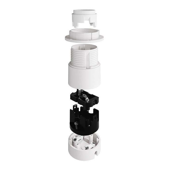 Plastikowa oprawka żarówki E27 do montażu natynkowego T-Plastima składa się kilku precyzyjnie wykonanych części, które dokładnie do siebie pasują i tworzą zwartą i funkcjonalną całość. Konstrukcyjnie składa się z obudowy zewnętrznej (osłona dekoracyjna) i własnej oprawki funkcjonalnej przeznaczonej do umieszczenia żarówki: