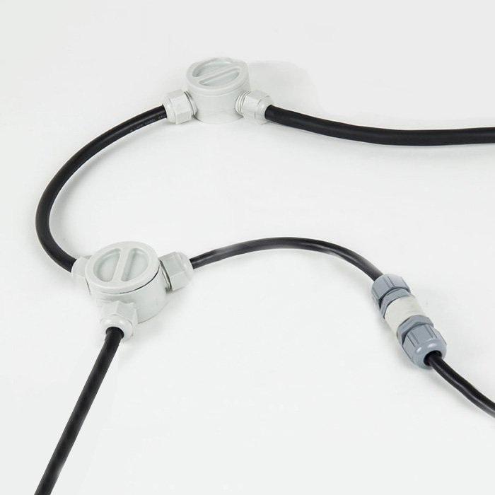 Złącze T jest przeznaczone do kabli dwużyłowych o średnicy zewnętrznej 6–9 mm² oraz przewodów o przekroju 2x 0,5–0,75 mm². Dzięki tym parametrom zapewnia szeroką kompatybilność z powszechnie stosowanymi kablami zasilającymi. Podłączenie przewodów odbywa się za pomocą zacisków śrubowych, które zapewniają mechanicznie mocne i elektrycznie niezawodne zamocowanie połączenia.