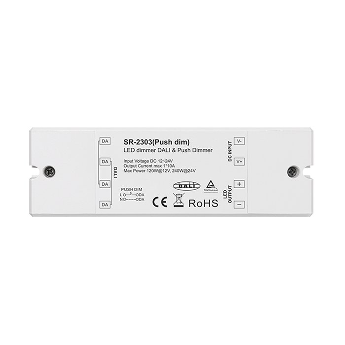 DALI Ściemniacz o oznaczeniu SR-2303-PUSH DIM to idealne rozwiązanie do nowoczesnego i wydajnego sterowania oświetleniem jednokolorowych taśm LED za pomocą protokołu DALI. Umożliwia podłączenie dostępnych na rynku wyłączników przyciskowych za pomocą magistrali PUSH-DIM lub integrację z systemami automatyki budynkowej za pomocą protokołu DALI w celu precyzyjnego i płynnego ściemniania jednokolorowych taśm LED: