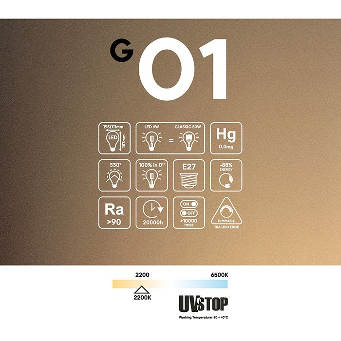 Ghost - G01 designowa żarówka ściemnialna z technologią LED filament umożliwia płynne ściemnianie za pomocą ściemniaczy TRIAK 230V, które pozwalają również na ustawienie minimalnej jasności. Ściemnianie żarówki jest opcjonalną funkcją, z której można korzystać lub nie.