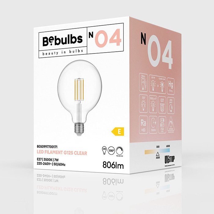 Przezroczysta, ściemnialna żarówka LED BeBulbs-T z gwintem E27 to energooszczędne źródło światła o długiej żywotności. Dominujący kształt przypominający globus G125 (Globe – Ø 125 mm w najszerszym miejscu) idealnie komponuje się z konwencjonalnymi oprawami oświetleniowymi, łącząc klasyczny design z nowoczesną technologią LED. Precyzyjne wykonanie techniczne w połączeniu z renomowaną jakością marki BeBulbs gwarantuje doskonałe właściwości świetlne, wysoką wydajność i maksymalną satysfakcję z codziennego użytkowania.
