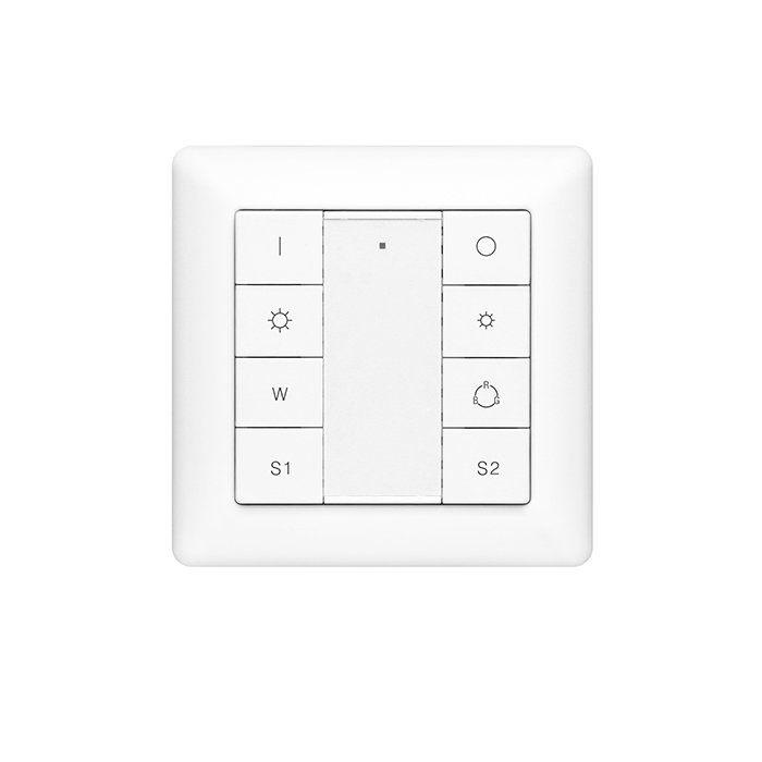 Sterownik RGBW ZigBee na ścianę z ośmioma przyciskami o oznaczeniu SR-ZG9001K8-RGBW to modułowe rozwiązanie do sterowania kolorami taśm LED RGBW, oświetleniem przez sygnał sterowania ZigBee 3.0. Bezprzewodowy sterownik RGBW ZigBee na ścianę z wieloma funkcjami przyczynia się do zwiększenia komfortu użytkownika, poprawy elastyczności sterowania i oszczędności energii.