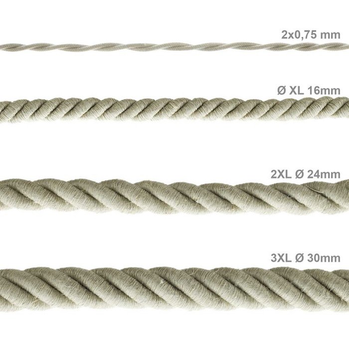 Kabel w sznurze został wykonany ze lnu. Cechą charakterystyczną lnianego sznura z przewodem elektrycznym jest matowe odwzorowanie kolorów i szorstka powierzchnia. Len wygląda bardzo naturalnie, świetnie współgra z takimi materiałami jak drewno czy metal. Do każdego wnętrza wnosi odrobinę ciepła i natury. Idealne nadaje się do stworzenia przytulnego otoczenia za pomocą oświetlenia w stylu retro i vintage. Kabel w sznurze lnianym 24LIN przemawia do wszystkich twórczych dusz, ponieważ po prostu przyciąga uwagę.