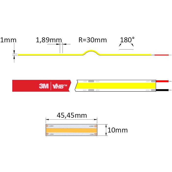 Wysokiej jakości mocno świecąca taśma COB 24V SC24528 wyposażona jest w ułatwiającą montaż samoprzylepną taśmę dwustronną najwyższej klasy 3M VHB. Ten rodzaj taśmy samoprzylepnej zapewnia doskonałą przyczepność do powierzchni i najlepsze odprowadzanie ciepła.