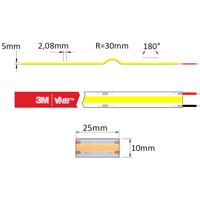 Biała taśma LED COB IP68 24V COB-SC24480 jest wyposażona w specjalną dwustronną taśmę klejącą 3M VHB 5915 na spodniej stronie. Ta samoprzylepna taśma służy do montażu na wybranym podłożu (zdecydowanie zalecamy użycie listew profilowych LED ze względu na chłodzenie i ochronę taśmy LED). Podłoże musi być gładkie i odtłuszczone. Do montażu można również wykorzystać szeroką ofertę #tablink#montaz#akcesoriów montażowych i kabli##.