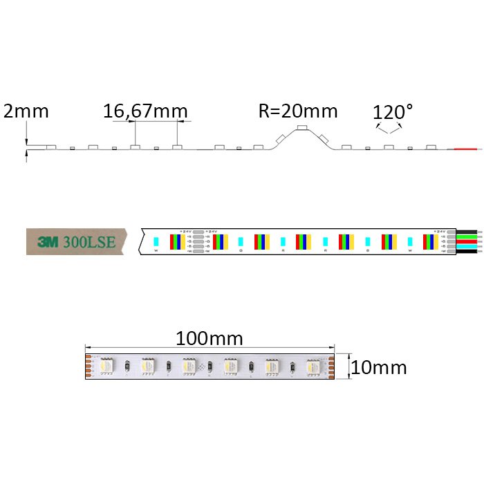 - Napięcie zasilania: 24V DC | Moc: 19,2W /1m | 14,4W RGB (RED, GREEN, BLUE) + 4,8W (WHITE)