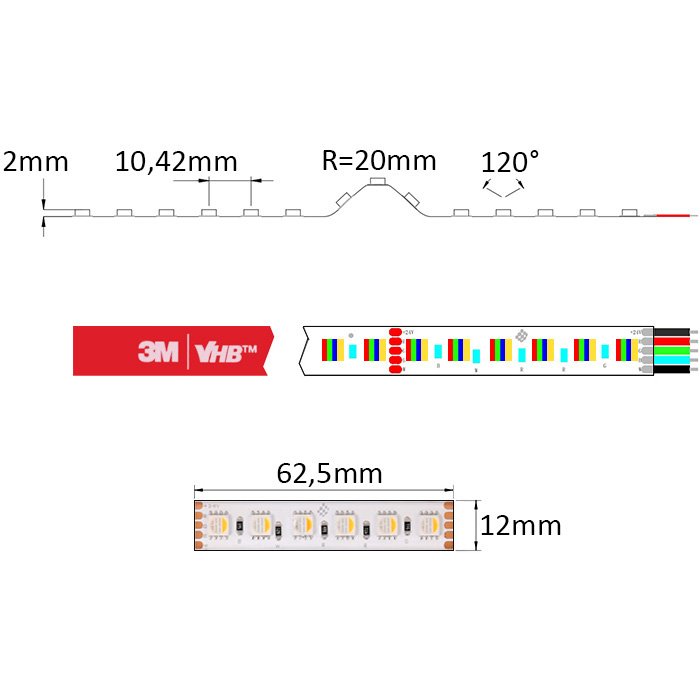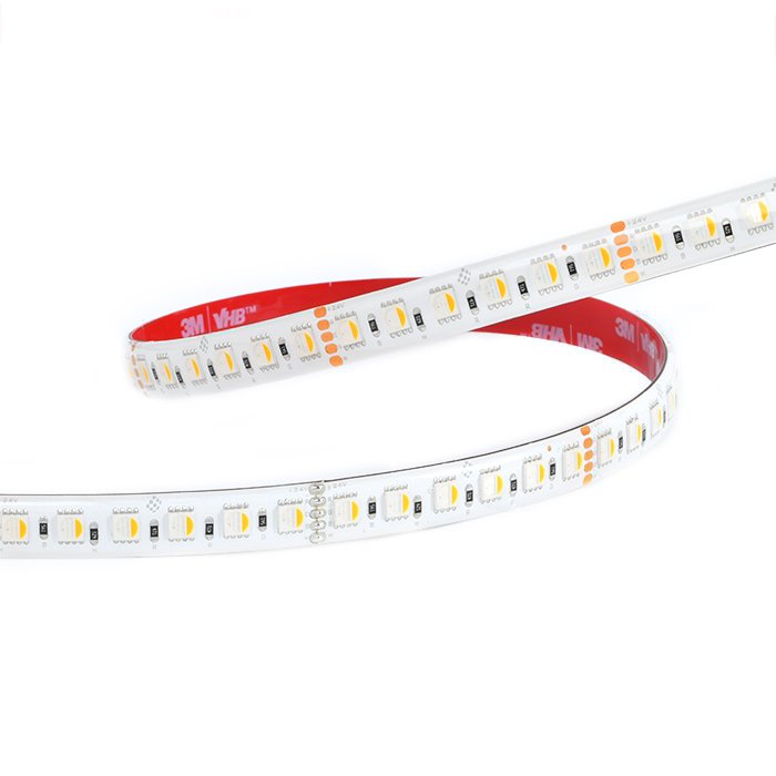 Wysokiej jakości mocno świecąca taśma LED RGBW IP65 24V RGBW2496 wyposażona jest w ułatwiającą montaż samoprzylepną taśmę dwustronną najwyższej klasy 3M VHB. Ten rodzaj taśmy samoprzylepnej zapewnia doskonałą przyczepność do powierzchni i najlepsze odprowadzanie ciepła.