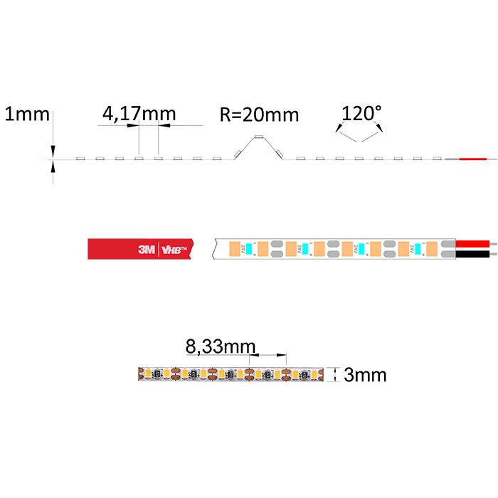 Biała taśma LED wąska 24V SC24240-5SLIM jest pokryta od spodu specjalną dwustronną taśmą 3M VHB GPL-040. Ta samoprzylepna taśma służy do montażu na wybranym podłożu (zdecydowanie zalecamy zastosować profile LED i listwy LED aluminiowe ze względu na chłodzenie i ochronę wąskiej taśmy LED). Musi być ono gładkie i odtłuszczone. Zaleca się podłączenie taśmy LED do źródła zasilania poprzez lutowanie.