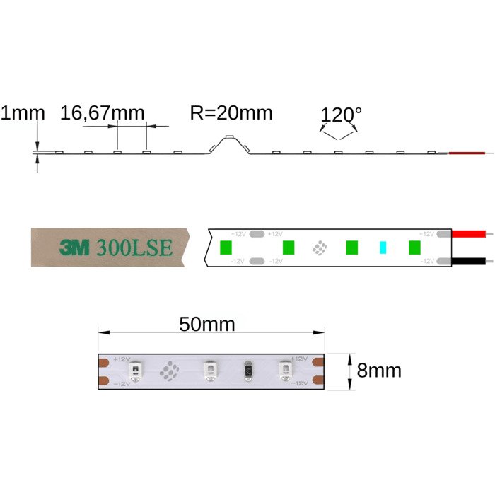 Pasek LED zielony 12V SC1260E jest pokryty od spodu specjalną dwustronną taśmą 3M 300LSE. Ta samoprzylepna taśma służy do montażu na wybranym podłożu (zdecydowanie zalecamy zastosować profile LED i listwy LED aluminiowe ze względu na chłodzenie i ochronę taśmy LED zielonej). Musi być ono gładkie i odtłuszczone. Zaleca się podłączenie taśmy LED do źródła zasilania poprzez lutowanie.