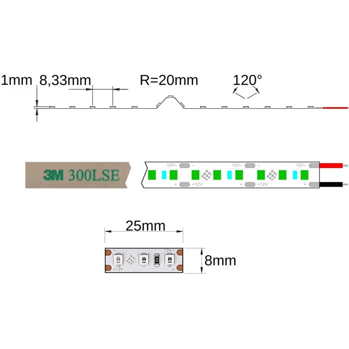 Pasek LED zielony 12V SC12120E jest pokryty od spodu specjalną dwustronną taśmą 3M 300LSE. Ta samoprzylepna taśma służy do montażu na wybranym podłożu (zdecydowanie zalecamy zastosować profile LED i listwy LED aluminiowe ze względu na chłodzenie i ochronę taśmy LED zielonej). Musi być ono gładkie i odtłuszczone. Zaleca się podłączenie taśmy LED do źródła zasilania poprzez lutowanie.