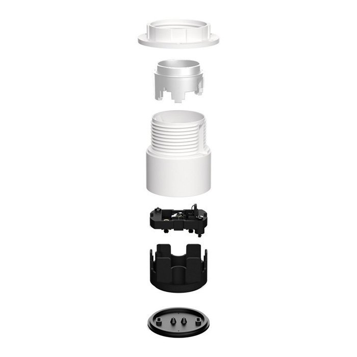 Plastikowa oprawka żarówki E27 do montażu natynkowego Plastima składa się z kilku precyzyjnie wykonanych części, które dokładnie do siebie pasują i tworzą zwartą i funkcjonalną całość. Konstrukcyjnie składa się z obudowy zewnętrznej (osłona dekoracyjna) i własnej oprawki funkcjonalnej przeznaczonej do umieszczenia żarówki: