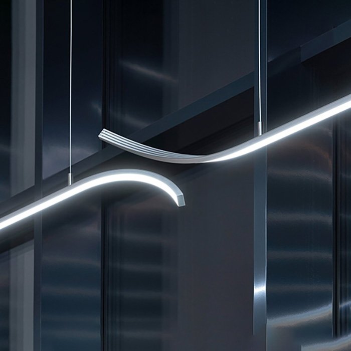 Lampa liniowa LED wisząca o oznaczeniu DIMIDIA-H-1 to zestaw dwóch opraw o delikatnie zakrzywionym korpusie. Jest to wysokiej klasy nowoczesna oprawa oświetleniowa, a także stylowy element wyposażenia wnętrz. Zakrzywienie na obu końcach nadaje oprawie dynamiczny i nowoczesny wygląd, wprowadzając do wnętrza ciekawy element wizualny. Oprawa liniowa łączy estetykę z funkcjonalnością, a jej zakrzywienie pozwala nie tylko oświetlać przestrzeń, ale także kierować światło w nietypowych kierunkach, tworząc różne efekty świetlne i cienie.