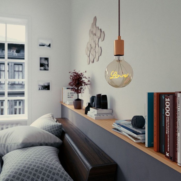 Ściemnialna żarówka LOVE E27 o oznaczeniu Deco Up Gold i mocy 5 W to dekoracyjne i energooszczędne źródło światła. Ze względu na popularny kształt bursztynowej szklanej bańki G125 (Globe - w najszerszym miejscu Ø 125 mm), stanowi ona świetną alternatywę dla wszystkich lamp wiszących mających oprawki E27. Tym, co czyni żarówkę Deco Up Gold niezwykłym elementem dekoracji oświetleniowej, jest kształt żarnika w romantycznym napisie LOVE. Po zapaleniu żarówki vintage widoczne stają się również zalety bursztynowej barwy szkła. Emitowane światło o żółtawym odcieniu przenika do pomieszczenia. Ściemnialna żarówka G125 LOVE emituje oświetlenie sceniczne i harmonijne o następującej charakterystyce: