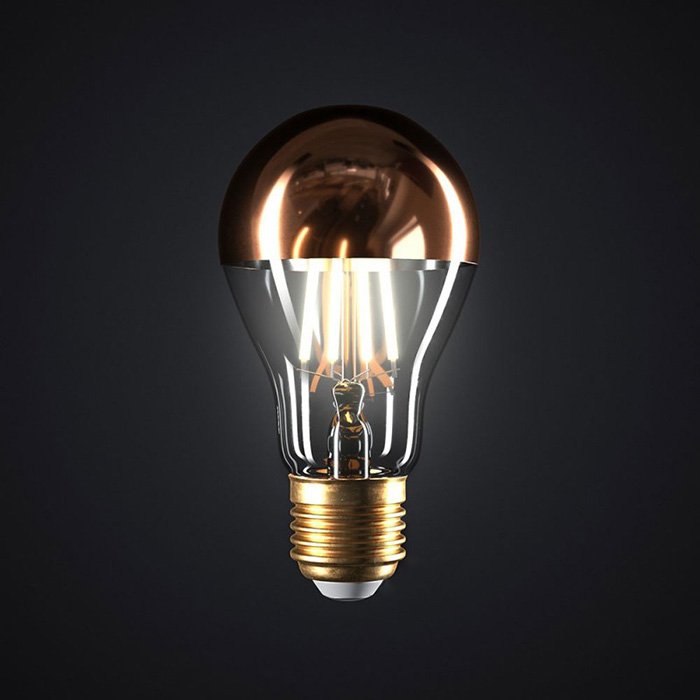 Ściemnialna żarówka lustrzana E27 o oznaczeniu Dome Copper i mocy 7 W to ozdobne energooszczędne źródło światła. Ze względu na popularny kształt szklanej bańki A60 (Drop - w najszerszym miejscu Ø 60 mm), stanowi ona świetną alternatywę dla wszystkich wiszących opraw oświetleniowych i lamp mających oprawki E27. To, co sprawia, że żarówka Dome Copper jest niezwykłym elementem dekoracji oświetleniowej, to miedziana lustrzana kopuła. Zacieniona górna część żarówki powoduje, że emitowane światło przenika do pomieszczenia tylko przez przezroczysty szklany obwód żarówki. Ściemnialna żarówka lustrzana A60 z niekierunkową emisją światła jest stosowana w celu uzyskania nieoślepiających efektów oświetleniowych ze światłem o następujących właściwościach :